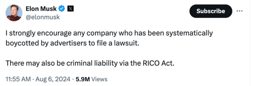 Elon Musk Says Advertisers Are Doing The RICO If They Don't Give Him Cash Read More »